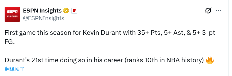 根据数据统计显示,这是杜兰特本赛季首次单场比赛得到至少35分5助攻且命中5+三分球,而在职业生涯他总计21次做到这点,可以排在NBA历史第10位。