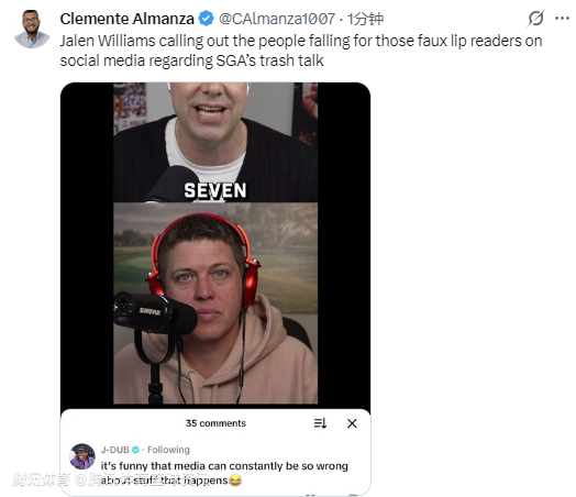 北京时间1月17日,雷霆队球员杰伦-威廉姆斯更新个人社交媒体,谈到了亚历山大与杜兰特在比赛之间的交谈被误解为垃圾话一事,并对进行不实唇语解读的媒体人进行了批评。