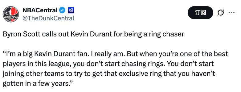 斯科特公开指责杜兰特是“追冠者”,他表示:“我是杜兰特的铁杆粉丝,真的是。但当你是联盟最顶尖的球员之一时,不该去追着冠军跑。你不该为了拿到那枚自己几年没得到的冠军戒指,就开始加入其他球队。”
