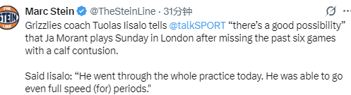 北京时间1月17日,灰熊队主教练伊萨洛接受媒体采访,透露莫兰特大概率将从小腿伤势中康复,出战在伦敦对阵奥兰多魔术的比赛。