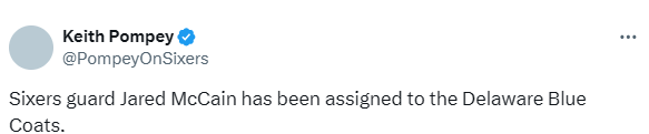 北京时间1月18日,据76人队记Keith Pompey报道,球队已将后卫麦凯恩下放至G联盟附属球队特拉华蓝衫队。