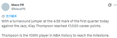 北京时间1月18日,NBA常规赛继续进行,独行侠对阵爵士。本场比赛,独行西球星克莱替补登场。