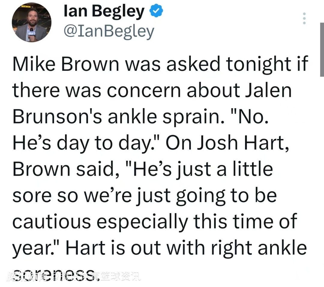 当被问及是否担心布伦森的脚踝扭伤时,布朗表示:“不担心,他的情况是每日观察(出战成疑)。” 布伦森将缺席本场比赛,他在此前对阵国王的第一节比赛当中遭遇脚踝扭伤,随后退出了比赛。上一场对阵勇士也没有出战。根据数据统计显示,自布伦森加盟尼克斯以来,尼克斯缺少布伦森战绩为18胜20负,而在他出战的比赛中战绩为153胜94负。