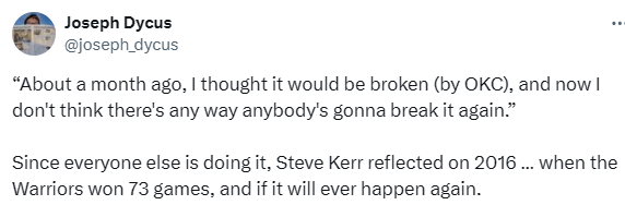 科尔还称自己从不会花太多时间回顾过去,关于73胜球队仅在训练馆悬挂了一面纪念横幅。科尔承认,73胜是一项不可思议的成就,赢下如此多的比赛令人震惊。他特别指出,那段时间球队在约130场比赛中从未遭遇两连败,这是他最喜欢的一项数据。“在这个联盟,连续输两场几乎是不可避免的,所以那真的非常夸张。” 科尔说道,尽管为曾是那支球队的一员感到骄傲,但他更专注于当下。