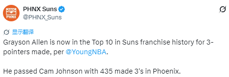 比赛进行过程中,阿伦在命中1记三分球后,以435记三分球命中数超越卡梅隆-约翰逊,跻身队史三分命中数榜单前十。