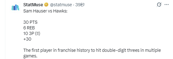豪瑟此役三分球21投10中,得到了30分,他是凯尔特人队历史上首位能多次单场命中两位数三分球的球员。