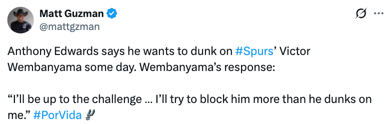 马刺主帅米奇-约翰逊曾表示球队在下半场表现得有些漫不经心时,对此文班亚马回应道:“我同意,我们知道这是个问题,我认为我们的想法是对的,但我们需要明确知道自己该达到什么样的目标。”
