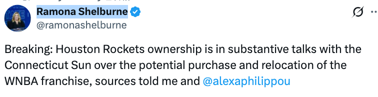 今年早些时候,休斯顿是有意全资收购太阳队的方之一,最终将报价提至2.5亿美元,这一金额与克利夫兰、底特律、费城今年支付的WNBA扩军费持平。今年7月初,太阳队曾达成协议,以创纪录的3.25亿美元售价,将球队卖给前凯尔特人小股东史蒂夫-帕柳卡牵头的集团,后者计划将球队迁至波士顿。但WNBA直接叫停了这笔交易,强调“搬迁决策由WNBA董事会决定,而非单支球队”,并表示“已完成扩军流程的城市优先级高于波士顿”。