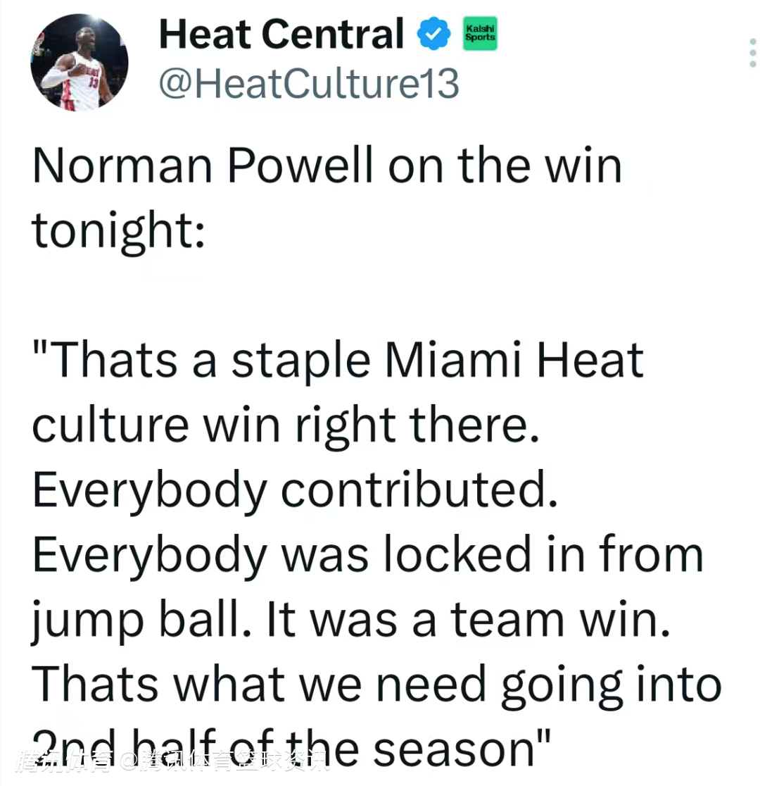 关于今天的胜利,鲍威尔说道:“这正是迈阿密热火文化的标志性胜利。每个人都做出了贡献,从跳球开始,所有人就全神贯注。这是一场团队胜利,也是我们进入赛季下半程所需要的胜利。”