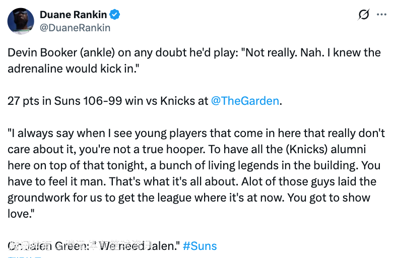 另外布克也谈道:“我总是说,当我看到那些来到这里却完全不尊重这里的年轻球员时,我会觉得他们不是真正的篮球人。今晚,尼克斯的所有名宿都在这里,还有一堆传奇人物也在球馆里。你必须感受到这一切,这才是篮球的意义所在。正是这些前辈们为我们奠定了联盟今天的基础。你必须表达敬意。”