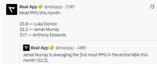 根据数据统计显示,穆雷在1月份场均可以得到32.2分,仅次于东契奇的33.8分,排名联盟第二位。爱德华兹月均31.7分,排在第三位。
