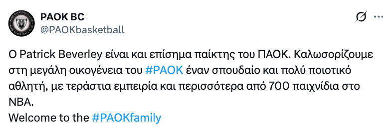 我们诚挚欢迎这位经验丰富、实力顶尖的球员加入PAOK大家庭。贝弗利拥有辉煌的NBA生涯,在这座全球顶级篮球殿堂征战11载,累计出战737场顶级赛事。