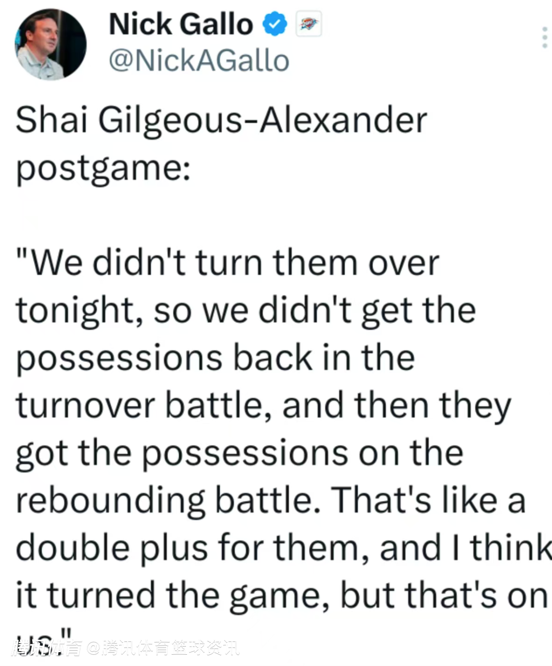亚历山大说道:“我们今天没能迫使他们出现失误,所以在失误争夺中没能拿回球权;而在篮板拼抢上,他们又抢走了更多球权。这对他们来说相当于双重优势,我认为这是扭转比赛走势的关键,但责任在我们自己。”