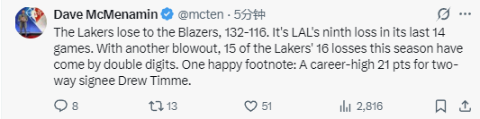 北京时间1月18日,NBA常规赛继续进行,湖人队116-132不敌开拓者队。这是湖人队本赛季输掉的第16场比赛,而这其中有15场比赛,湖人队都是以两位数的分差落败。
