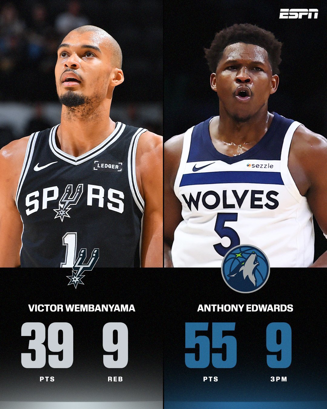 当爱德华兹轰出生涯新高的55分时,似曾相识的危机感悄然浮现,但维克托-文班亚马与圣安东尼奥马刺成功扼制了这种趋势,最终以126比123险胜明尼苏达森林狼。据ESPN数据统计,本场两位状元秀合计砍下94分,创下现代选秀时代以来状元对决的最高总得分纪录。