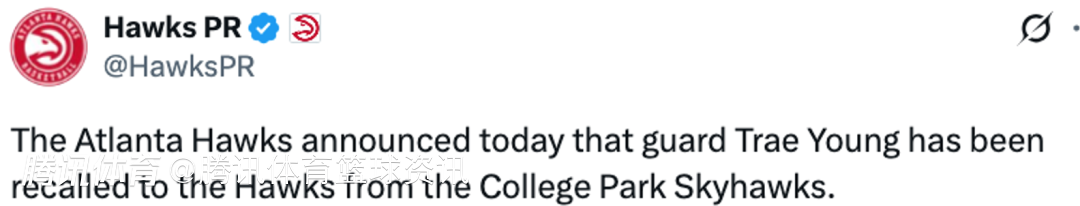 北京时间12月17日,老鹰官方宣布,已经从G联盟附属球队天鹰队召回特雷-杨,今天稍早前,球队刚刚宣布将其下放,他们之所以这么做是为了让特雷-杨可以在天鹰队参加训练。
