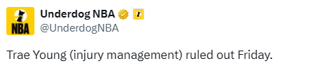 特雷-杨此前在老鹰常规赛第五场比赛中右膝受伤,后续确诊为内侧副韧带扭伤。连续缺阵22场后他因无法达成65场的参赛门槛,将失去赛季末各项奖项(包括最佳阵容)的评选资格。