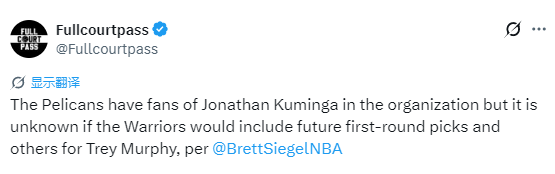 北京时间12月20日,据记者Brett Siegel报道,有消息人士透露,鹈鹕球星特雷-墨菲始终稳居勇士头号引援目标榜单,同时值得一提的是,鹈鹕队内依然有不少青睐库明加的支持者。只是目前还不确定,勇士是否愿意在库明加之外,额外拿出未来首轮签及其他筹码,来换取特雷-墨菲。