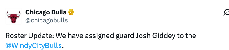 北京时间1月19日,公牛官方宣布,球队已经将吉迪下放至G联盟附属球队风城公牛,之后公牛队记KC-Johnson跟进报道,如果吉迪顺利完成训练,没有出现任何意外,可以关注他在周三(对快船)和周五(对森林狼)复出的可能性。