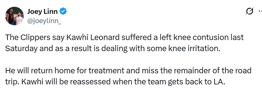 莱昂纳德将会缺席快船周二客场对阵奇才、周三客场对阵公牛的两场比赛,他的伤情复查将安排在快船主场迎战湖人的比赛之前。