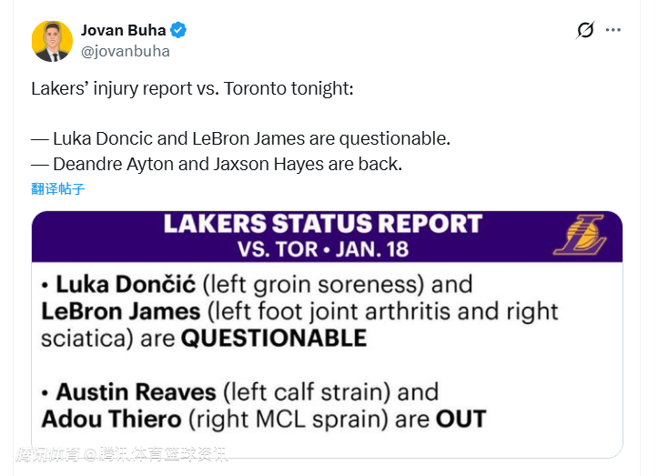 北京时间1月19日,NBA常规赛继续进行,湖人对阵猛龙。赛前,湖人方面更新本场比赛伤情报告,东契奇和詹姆斯出战成疑;艾顿和海斯回归。