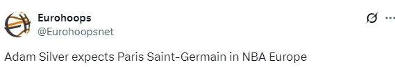 北京时间1月19日讯,据队报报道,NBA总裁萧华在谈及欧洲联赛推进计划时透露,有意将巴黎圣日耳曼列为该联赛潜在特许球队。