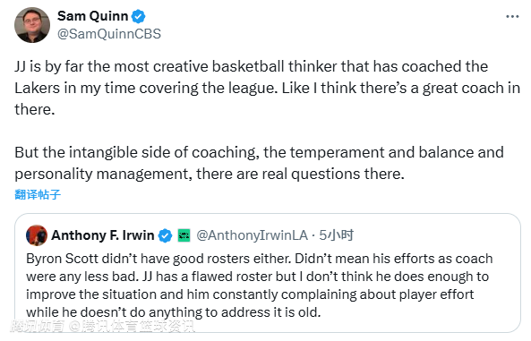 对此,CBS记者Sam Quinn转发了该言论并发表了自己的看法:“在我报道NBA的这些年里,雷迪克无疑是我见过的湖人主帅中,拥有最具创造力篮球思维的人之一,他确实具备成为伟大教练的潜质。不过在执教的精神层面,包括情绪管理、心态平衡以及更衣室关系的掌控上,雷迪克显然还存在明显的短板。”