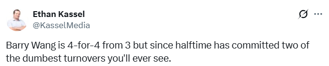 下半场,王俊杰出现失误,对手抢断扣篮,打了不到3分钟,王俊杰被换下。比赛还剩13分多钟时,王俊杰回到场上,他很快抢下一个防守篮板,但又遭对手抢断并完成扣篮。王俊杰再次被换下,他在下半场没有获得什么机会。前方记者Kassel表示,王俊杰上半场三分4中4,但下半场出现了两次相当愚蠢的失误。这两次失误,也让主帅没有在最后8分36秒使用王俊杰。