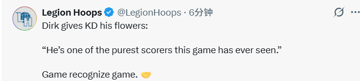 见证他的职业生涯真是一种荣幸。正如我之前所说,他是我见过的技术最纯粹、球商最高的球员之一。祝贺你,杜兰特。继续加油,再创佳绩,勇往直前。祝你好运!”