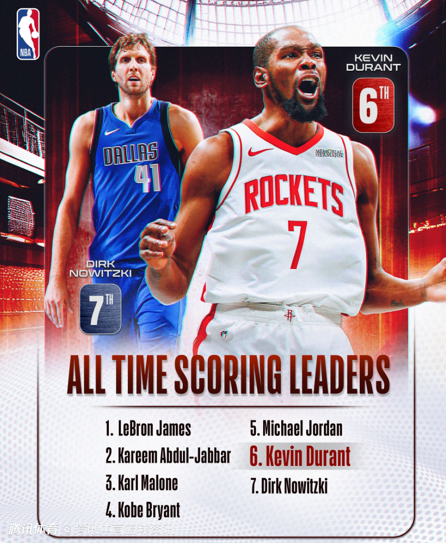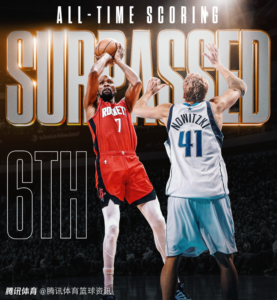 北京时间1月19日,NBA常规赛,火箭主场以119-110击败鹈鹕,此役杜兰特拿到18分6篮板8助攻,他也在本场比赛迎来了里程碑,生涯总得分超越诺天王,升至历史第六位。