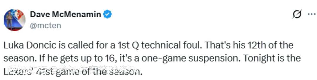 北京时间1月19日,NBA常规赛,湖人主场对阵猛龙,首节比赛,东契奇不满裁判判罚,被吹罚技犯。