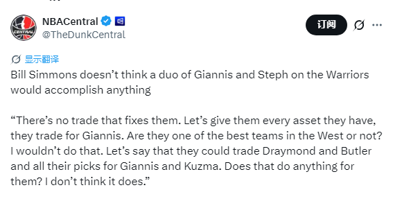 西蒙斯说道:“没有任何一笔交易能拯救现在的他们。就算把勇士所有的筹码都拿出来,换来字母哥,他们就能跻身西部顶级强队之列吗?我看未必。退一步讲,就算勇士能用追梦、巴特勒,再加上所有选秀权,换来字母哥和库兹马,这笔交易就能让球队脱胎换骨吗?我认为并不能。”
