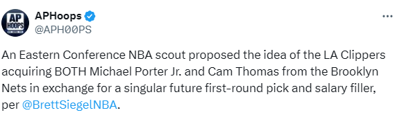 北京时间12月20日,根据记者Brett Siegel的报道,一位NBA东部联盟的球探提出方案:快船队可以用一个未来首轮签,外加一名薪资匹配球员作为筹码,从篮网队同时得到小迈克尔-波特与托马斯。