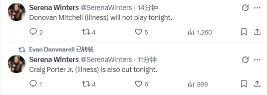 除了米切尔之外,克莱格-波特也将因病缺席本场比赛。公牛队除了艾森格之外,其余球员都可出战,但多森姆和特雷-琼斯的上场时间会被限制在24分钟以内。