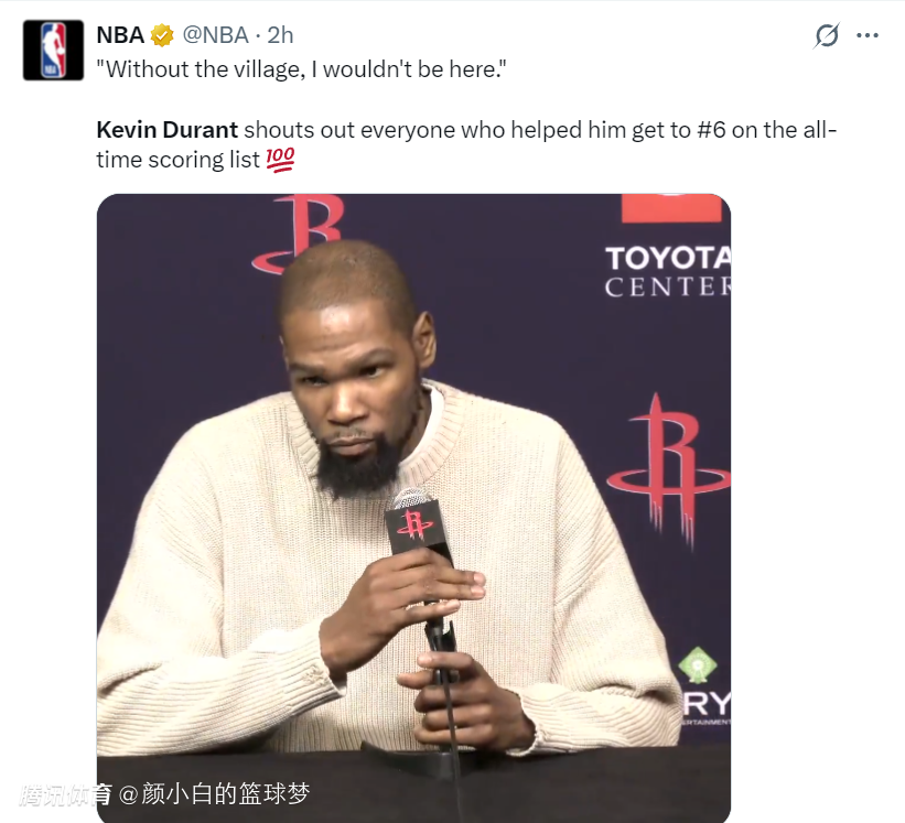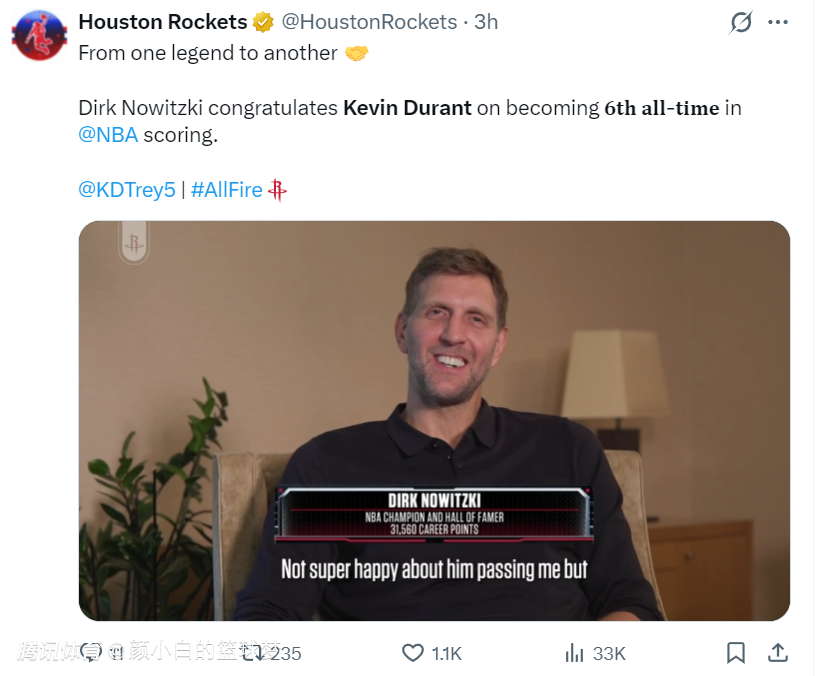 诺天王还专程为KD录制了庆祝视频,德克说道:杜兰特是篮球历史上最纯粹、最流畅的得分手之一。