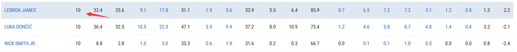 勒布朗-詹姆斯自年满41岁后已经打了10场比赛,这十场比赛他场均33.4分钟,拿到25.6分7.2篮板7.2助攻1.2抢断0.8盖帽,命中率51.1%,三分命中率33.9%,这对于一位41岁的老将来说已经是绝无仅有的存在。