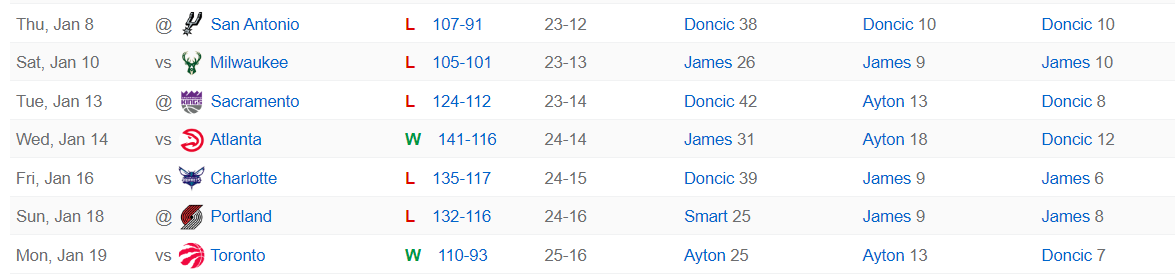 湖人队过去的7场比赛只赢下其中的两场,而且过去的7天时间里湖人队打了5场比赛,这已经是NBA7天时间最多的场次,可作为41岁的詹姆斯打满五场,东契奇都只打了4场,这五场比赛詹姆斯场均32.5分钟,拿到25.2分7篮板6.8助攻1抢断1.2盖帽,命中率50.6%,三分命中率36.4%,他真的已经很努力。