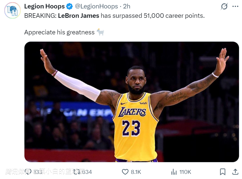 美媒LH写道:重大消息,勒布朗-詹姆斯达成51000分里程碑,钦佩他的伟大之处GOAT。