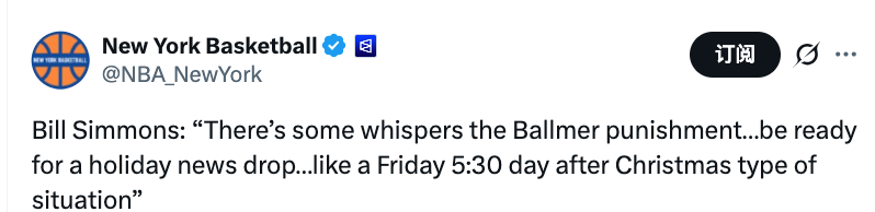 西蒙斯表示:“坊间有些风声,大家要做好在圣诞节假期期间突然爆出新闻的准备。有传言说可能会选在圣诞节后的周五下午5点半这种时间点。随着全明星赛日益临近,联盟必须有所表态。他们不可能在不公布调查结果的情况下就进入全明星周末,我认为我们即将知晓最终处罚决定——如果确实存在处罚的话。”