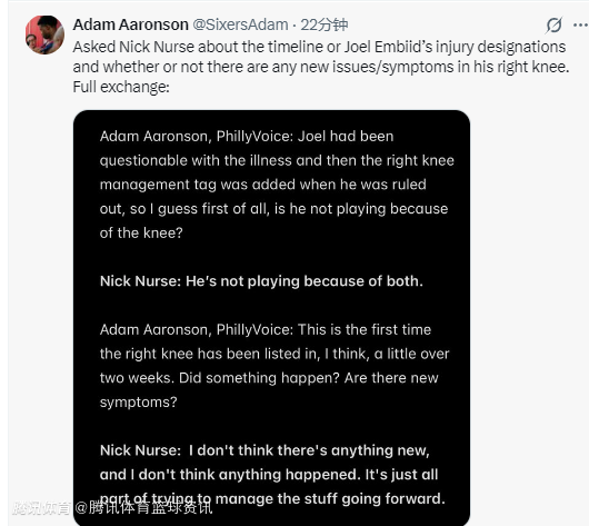 在赛前的新闻发布会上,有记者就恩比德的缺席问题向纳斯提问,后者也回应了恩比德的右膝重新出现在伤病报告中的原因。