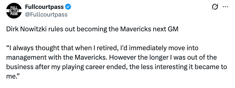 北京时间1月20日,近期,独行侠名宿诺维茨基接受了媒体的采访,期间他明确表示,自己不会担任达拉斯独行侠队的下一任总经理。