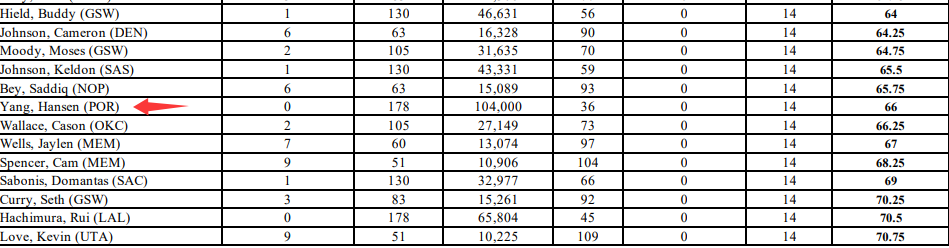 杨瀚森的加权得分是66,在他后一位是雷霆的卡森-华莱士,在他前一位是鹈鹕的萨迪克-贝。