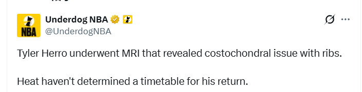 北京时间1月20日,热火官方发布消息,宣布队内球星希罗接受了核磁共振检查,结果显示其肋骨存在肋软骨损伤。热火队目前尚未确定他的归队时间表。