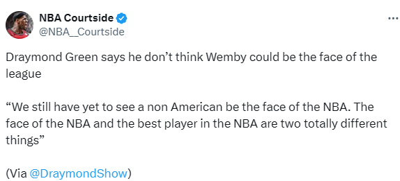 追梦说道:“文班的问题在于,我们至今没见过任何非美国球员能成为NBA门面。NBA门面和联盟最佳球员完全是两码事。这项运动是美国人创造的、主导的,根也在美国——从头到尾都是美国人说了算。我们从没见过国际球员能成为NBA的门面,所以讨论这个话题时,这一点必须考虑进去。”