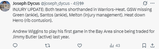 勇士方面:格林(脚踝)、桑托斯(脚踝)、梅尔顿(伤病管理)缺阵。热火方面:希罗(肋骨挫伤)缺阵。