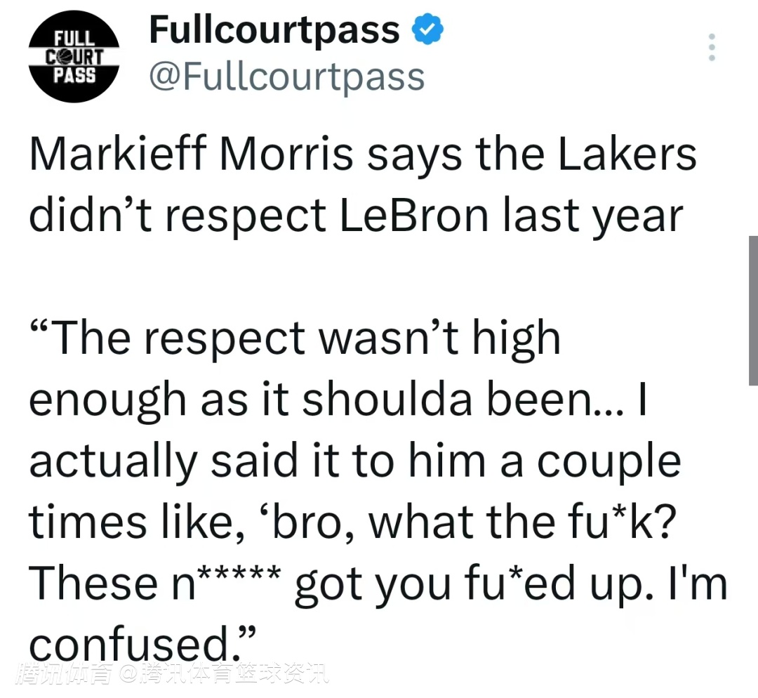 提到老队友詹姆斯,大莫直言:“上赛季在湖人,我总觉得很多时候对他的尊重配不上他的地位。2020年园区复赛时完全不是这个氛围,天壤之别。现在虽然有了东契奇,但那种尊重依旧缺位。我好几次跟詹姆斯吐槽:‘兄弟,这叫什么事?这帮人太过分了,我都搞不懂。’”