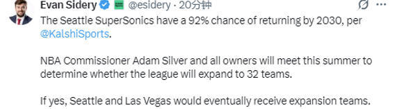北京时间12月20日,根据Kalshi Sports的预测,西雅图超音速队有92%的概率在2030年前重返联盟。