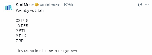 根据数据统计显示,本场比赛是文班亚马职业生涯第32次单场得分30+,追平了马刺队名宿马努-吉诺比利,并列排在队史第9位。目前在文班亚马身前的球员是德罗赞,他曾代表马刺队34次砍下30+。马刺队史单场30+场次纪录归属于“冰人”乔治-格文,他职业生涯288次单场砍下30+。