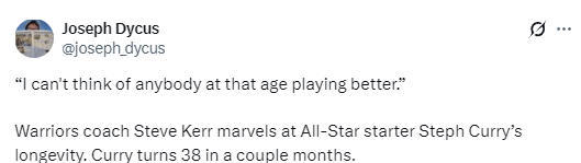 在谈到库里入选全明星首发的话题时,科尔说道:“对他来说意义重大。我今天给他打电话时就在想,我实在想不出还有谁在这个年纪能打得这么好,而且职业生涯后期还能保持高水准。显然,我真的没法想象有人能在这个年纪达到这么高的水平。我今天想了大概五秒钟,脑子里一个名字都没冒出来。所以,嗯,他整个赛季的表现都太出色了。”