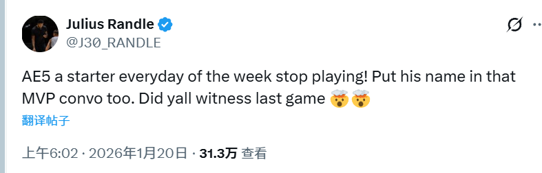 兰德尔写道:“爱德华兹天天都该是全明星首发,别闹了!也该把他的名字放进MVP讨论里。你们都看了上一场比赛吗?”